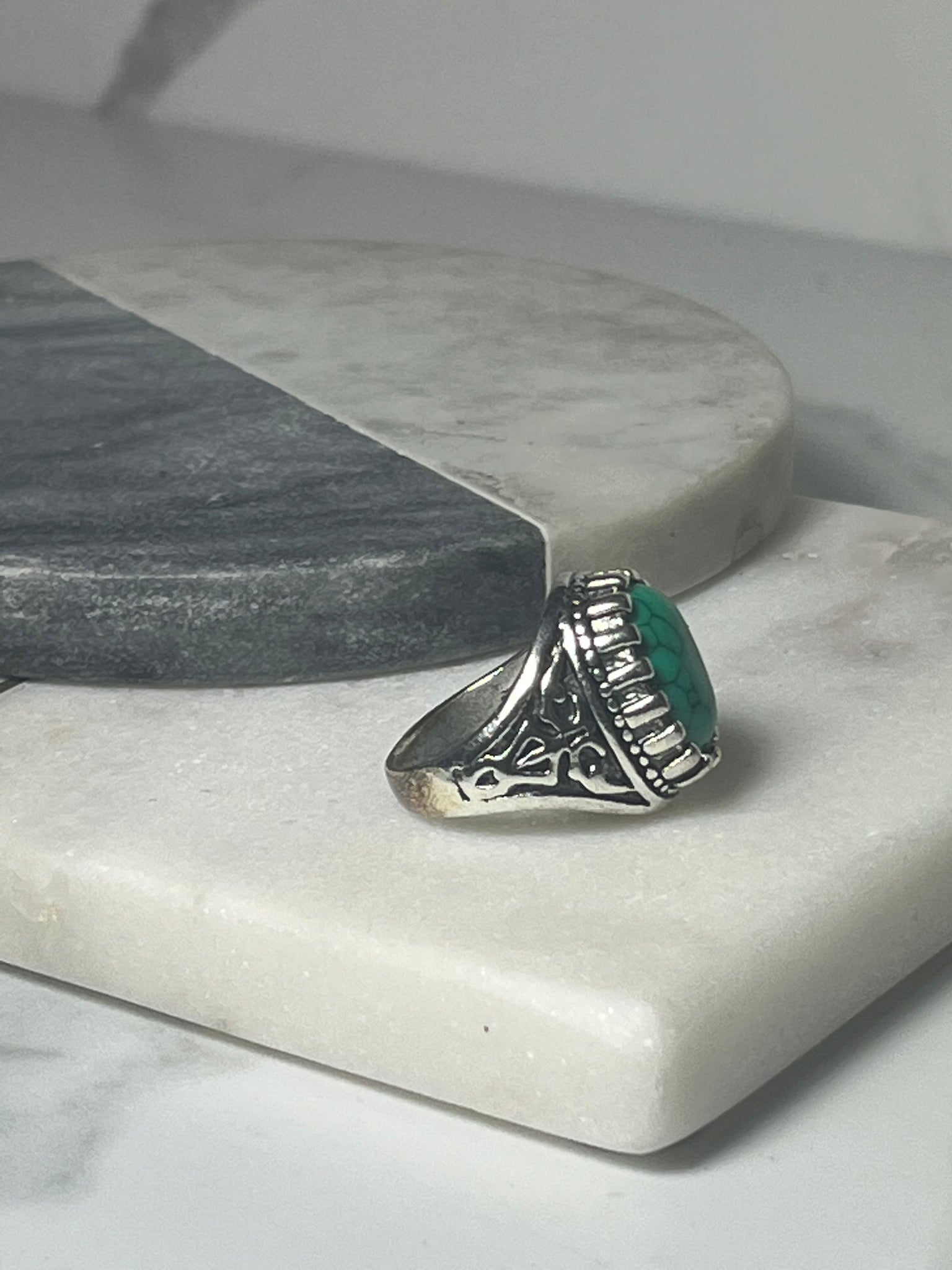 Handcrafted sterling silver with turquoise stone. Each stone is unique and may vary slightly from the photo.