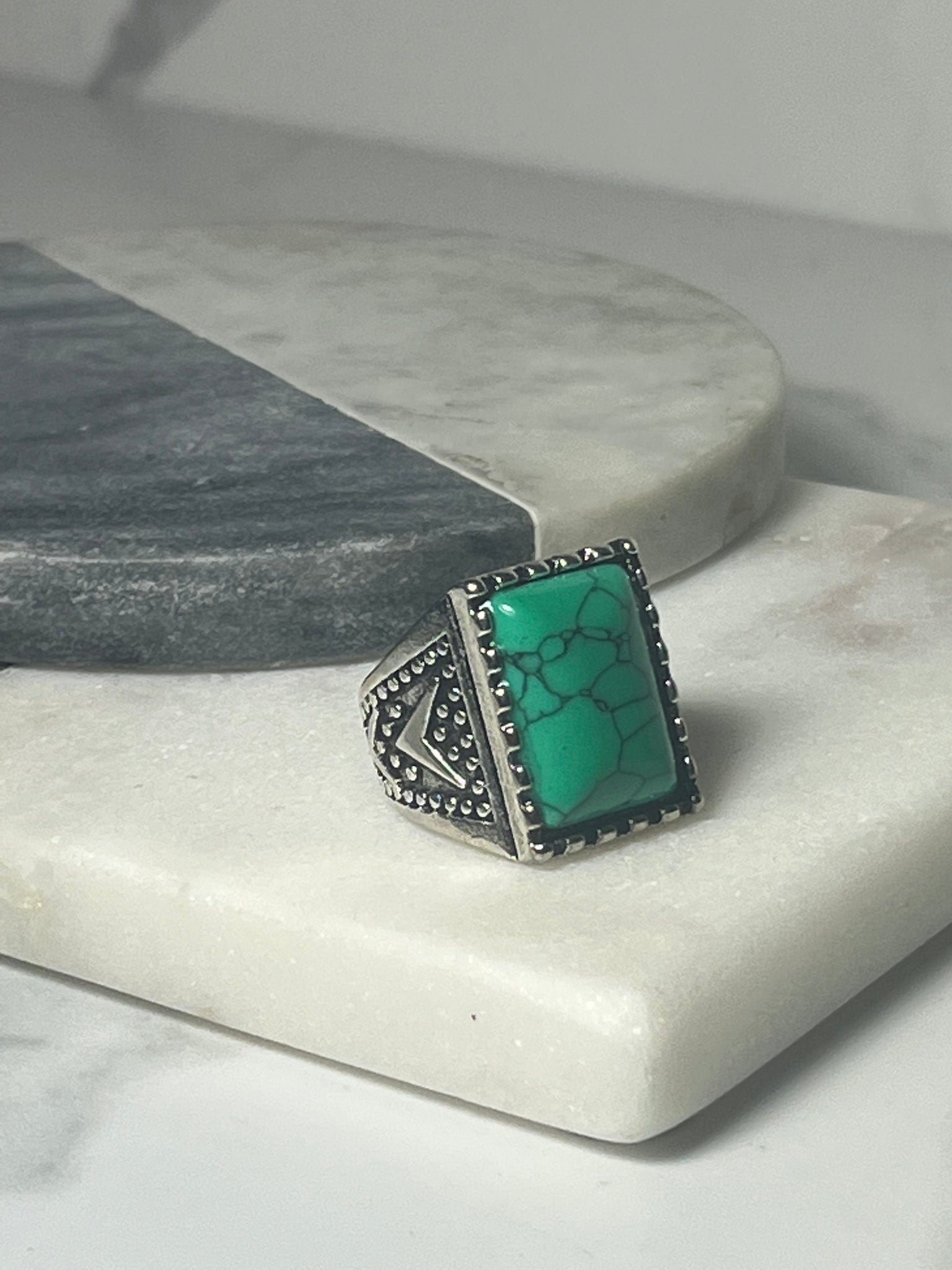 Handcrafted sterling silver with turquoise stone. Each stone is unique and may vary slightly from the photo.